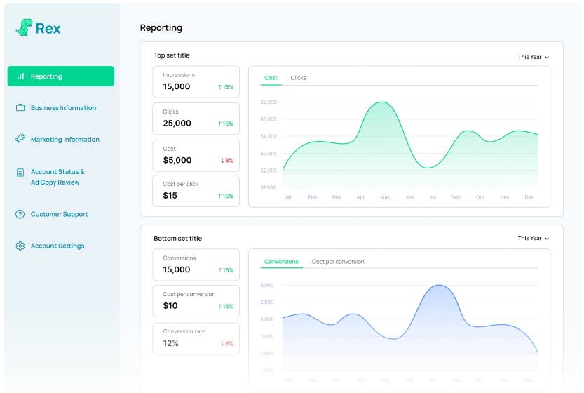 Your dashboard will give you the ability to update or adjust your business information, marketing budgets, goals and more with the click of a button. While Rex will be making all of your advanced decisions, your hand is still always “on the steering wheel” when you need to make adjustments.